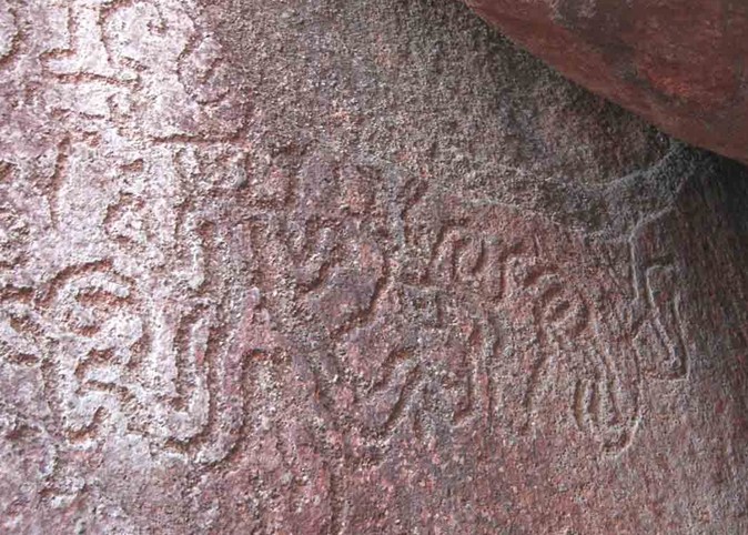 寶鏡灣摩崖石刻畫(huà),位于廣東珠海市高欄島寶鏡灣,于1989年10月被發(fā)現(xiàn),共4處6幅,散布于海灣所在的山腰、山麓200米范圍內(nèi),其中最大的一幅長(zhǎng)5米、高3米。巖畫(huà)陰刻于大塊平整的石面上,圖案密集而復(fù)雜,形狀有船、波浪、龍蛇、舞蹈人等,經(jīng)專(zhuān)家考證,是距今二三千年前青銅時(shí)代的產(chǎn)物,是南越先民生活的寫(xiě)照。
