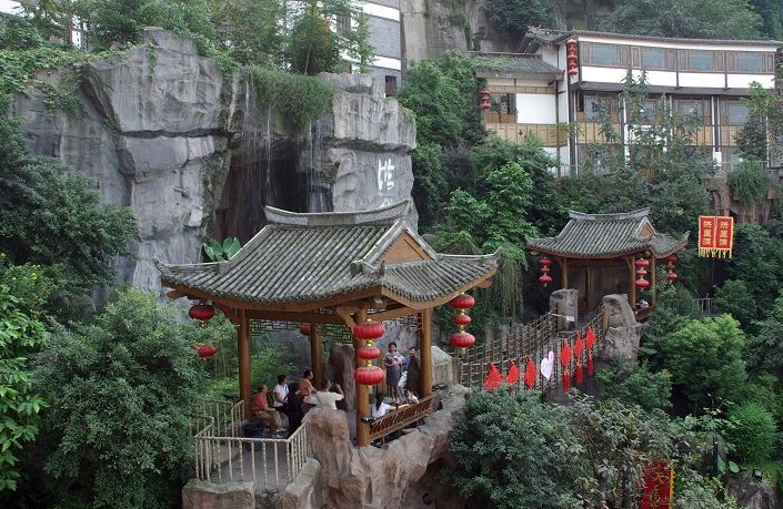 在古鎮(zhèn)磁器口最有特色的一景是茶館。昔日在這千年古鎮(zhèn),隨處可見茶館。當(dāng)年的水手、袍哥大爺、閑雜人等都喜愛出入此間,版權(quán)所有山東聊城聊之旅國際旅行社有限公司,轉(zhuǎn)載必究!茶館成了龍蛇混雜之地。在陪都期間,這一個(gè)小鎮(zhèn)茶館達(dá)100多個(gè)。其特色是“書場茶館”,又稱藝人茶館,是品茗欣賞民間藝術(shù)的地方。書場茶館戲曲品種不少:有川劇坐唱(打圍鼓)、四川清音、四川竹琴(揚(yáng)琴)、荷葉清唱更普遍是說書茶館。坐茶館的人絡(luò)繹不絕,座無虛席。賣報(bào)的報(bào)童:‘賣報(bào),賣報(bào)”的喊聲不絕于耳。姑娘和大嫂們:“賣瓜子,南瓜子,葵瓜子,賣花生,磁器口的鹽花生!”叫賣聲清脆響亮。特別是晚上能在茶館登臺(tái)說書的人,都是上品的高手,所以人們稱之為“品仙臺(tái)”,都是掛牌說書,看誰有絕技高招,誰能爭取更多的茶客,誰就能得到“紅包”。哪一位說書人講得好、茶館的生意必定會(huì)更加興隆、老板自然高興,說書人得的紅包就越厚實(shí)。直到如今,茶館仍是磁器口一景,百來米長的老街便有13家茶館,家家茶客滿座,古風(fēng)猶存。名特小吃毛血旺、軟燴千張、椒鹽花生被譽(yù)為磁器口的“三寶”。