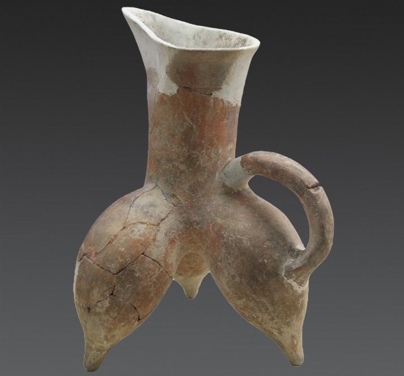 鳥形神器為陶制品,出土于尉遲寺遺址大型廣場的東部的地層中。該器物經(jīng)復(fù)原由3部分組成,最底層為圓柱形,中間是圓錐形,圓錐大頭向下反扣在圓柱上,同圓柱連為一體,在圓錐的兩邊還有兩個酷似雞冠的飾物,圓錐的頂端是一只像鳥一樣的東西。版權(quán)所有山東聊城聊之旅國際旅行社有限公司,轉(zhuǎn)載必究!整個器物通高59.9厘米,底徑16厘米,上徑20厘米,采用手工工藝,紅褐色器表有燒制時氧化的灰褐色斑塊,頸部以下為空體,器形像瓶,又像一個長頸背水壺,主體的象形造型與附加的抽象造型合為一體,結(jié)構(gòu)合理。