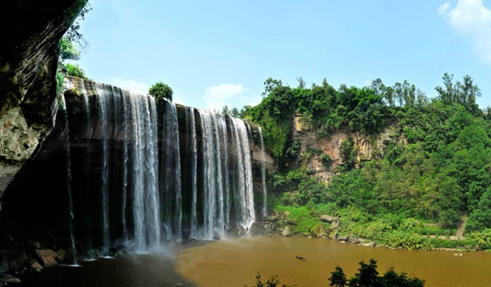 青龍瀑布(Qinglong waterfall)位于萬(wàn)州區(qū)甘寧鄉(xiāng),距萬(wàn)州城區(qū)30公里,景區(qū)面積60.13平方公里。這里是三國(guó)時(shí)期大將軍甘寧的故里。經(jīng)過專家測(cè)算,青龍 瀑布高 64.5 米,寬 115 米,比著名的黃果樹瀑布尚寬 19 米,是名副其實(shí)的亞洲之最。瀑布面積達(dá)7417.5平方米,是重慶市級(jí)風(fēng)景名勝區(qū)。該地區(qū)屬于典型的喀斯特地貌,山石陡峭,森林茂密。該瀑布的獨(dú)特之處不僅僅是因?yàn)樗男蹅验煟瞧俨嫉淖呦蚴浅使?,這使得瀑布成為名副其實(shí)的水簾洞。沿著瀑布內(nèi)部的小道前行,從瀑布里面眺望外面的景色,另有一番滋味。瀑布之下有一約 2000 平方米的石洞,造型奇特,令人神往,是游人坐洞觀瀑的絕佳去處;瀑布下游水草鮮美,落英繽紛,儼然陶翁之桃花源也。不遠(yuǎn)處是甘寧將軍墓和甘寧雕像。青龍瀑布上游是甘寧水庫(kù),是垂釣、蕩舟的好去處。對(duì)比中國(guó)其他地區(qū)的風(fēng)景名勝,青龍景區(qū)在自然景觀與人文景觀上都毫不遜色。