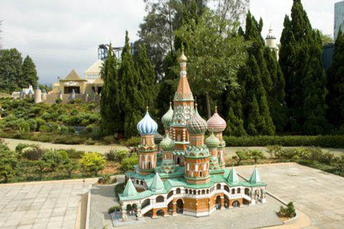 歐洲迷你景觀區(qū)包括歐洲許多代表性建筑,例如“古典時期”的希臘神殿、“羅馬式”的伏姆斯大教堂、圣法蘭西斯教堂的“哥德式建筑”及結合了回教拜占庭風格、哥德式尖拱、仿羅馬式拱廊的圣巴西爾大教堂。