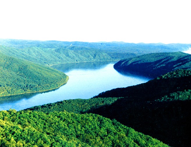 龍江三峽位于黑龍江蘿北段,三個(gè)美麗的峽谷分別是龍門峽、金龍峽和金滿峽,全長(zhǎng)共62公里。乘著小艇逆江而上,江風(fēng)夾著濕氣撲面而來(lái),直鉆進(jìn)人的毛孔里去。放眼望去,只見(jiàn)江水蜿蜒,江流湍急;兩岸山崖峻美,峰巒疊嶂。山環(huán)水抱,交相輝映,既有漓江的秀色,也有岷江的磅礴;既有長(zhǎng)江三峽的雄奇,又有桂林山水的清雋;山青如繡,水綠如絹,江山如畫,濃彩重墨中透著淡雅,清新豪放中顯得莊重。“早觀山,青灰欲染山凝黛;晚看嶺,云霞蒸蔚嶺含輝”。夕陽(yáng)西下,天這邊還是云霞燦爛,天那邊已是良月相伴。