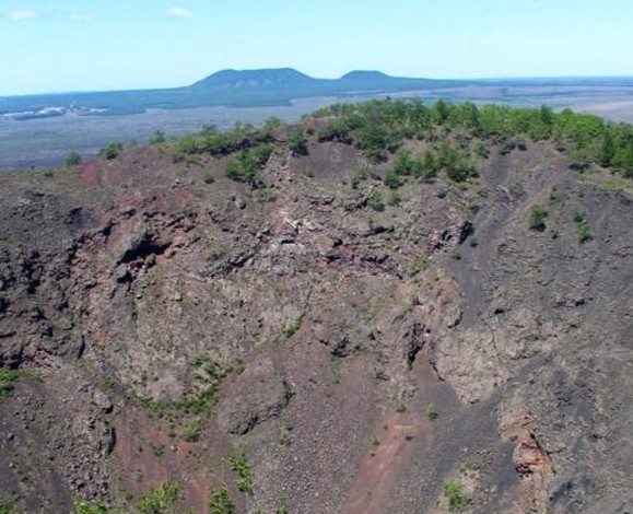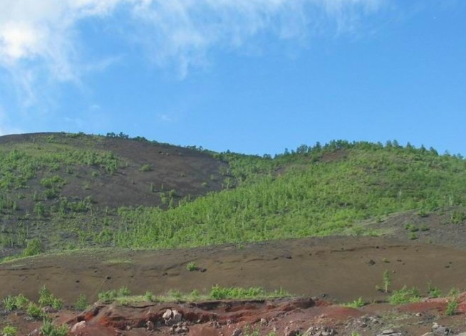 黑龍山南坡覆蓋的是火山礫,也稱火山灰?;鹕降[是氣體噴發(fā)的產(chǎn)物,當巖漿中氣體特別充沛時,就噴發(fā)出泡沫狀的熔巖,冷凝后,隨著風向散落在火山周圍。根據(jù)火山礫的分布情況,可以推測火山噴發(fā)時這里刮的是北風或西北風。山體由早、晚兩個火山錐體套疊而成,早期的錐體被晚期的噴發(fā)破壞并占據(jù),從植被的疏密上可以看出早晚的差別,它是一座休眠活火山。