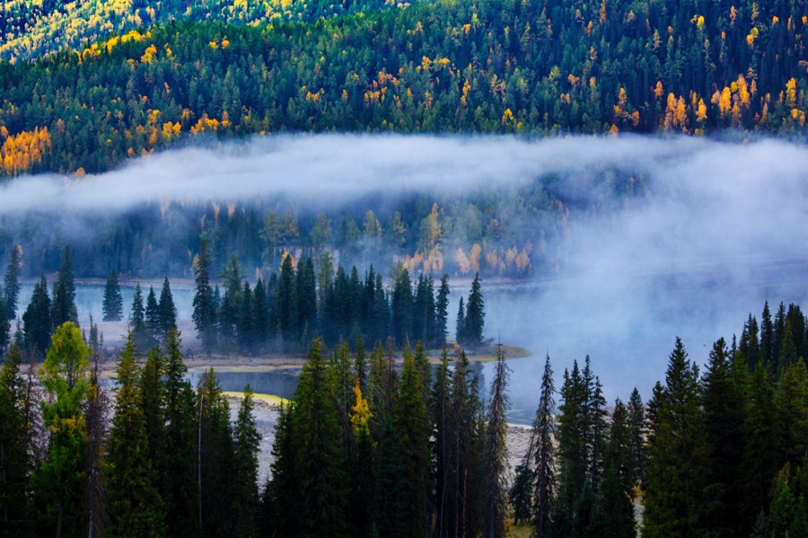 這里的河水將森林和草地分切成一塊塊似連非連的小島,人們稱之為“神仙灣”。它是喀納斯河在山澗低緩處形成的一片沼澤淺灘,從湖面背光處看去,在陽光照射下河水流光溢彩,連樹上的葉子都隨風搖曳、閃閃發(fā)光,仿佛無數(shù)珍珠任情灑落,為此也被稱為“珍珠灘”。這里常有云霧繚繞,山景,湖水,樹葉相互映襯;綠色的白樺林,湛藍的喀納斯,紅色的小木屋,超凡脫俗,如夢如幻,如臨仙境,神仙灣由此名。