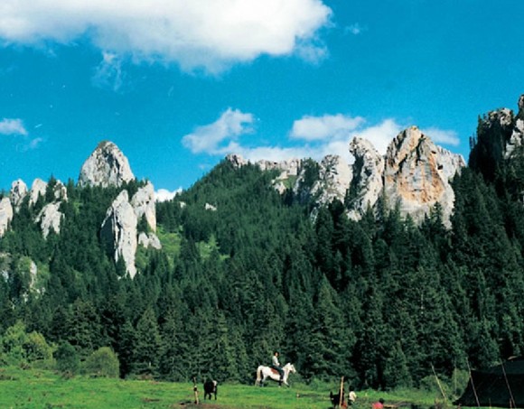 則岔石林全長10公里,是一處由地殼變化上升造成的硅灰?guī)r石景觀,經(jīng)過長年累月的風(fēng)雨剝蝕和流水的侵蝕,形成各異的奇峰怪石,版權(quán)所有山東聊城聊之旅國際旅行社有限公司,轉(zhuǎn)載必究!巍然屹立,遠(yuǎn)遠(yuǎn)望去,如一片巖石森林,有猴子窺月、玉女老嫗、將軍峰、和尚石等星羅棋布的奇峰怪石。壁立千仞的石峰間有長近百米的“石門一線天”,寬僅容一馱畜經(jīng)過,潺潺流水穿石門而過,石門內(nèi)修有百米的木棧道,供游客出入,有一夫當(dāng)關(guān),萬夫莫開之險(xiǎn),是進(jìn)入石林的必經(jīng)之路。壁立千仞、刀壁斧削般的則岔石林,以其鬼斧神工的奇特造型和森林茂密的秀麗景色,具有峨嵋之秀、華山之險(xiǎn)、泰山之雄、黃山之奇的特點(diǎn),可與昆明石林媲美,與四川九寨爭秀。這里是造山運(yùn)動(dòng)地塊抬升后,經(jīng)流水侵蝕、風(fēng)雨剝飾而形成的大面積硅灰?guī)r石林在則岔石林的峰頂及巖洞中,有大量古海洋生物化石。在藏族人民的心中,則岔石林的每一座山峰,都與藏族人民的英雄之神格薩爾王的故事有著密切聯(lián)系。洮河南岸溯則岔石林向南,山青水綠,奇花異草飄散幽香,珍禽異獸出沒林間。遠(yuǎn)遠(yuǎn)望見聳立的石壁組成天然屏障,雄偉奇險(xiǎn)。行至石林腳下,則見一條石峽訇然裂開,則岔河從中奔騰而出。相傳此“一線天”為藏族史詩中的英雄格薩爾一劍劈開,成為進(jìn)入石林的唯一通道。如今,石壁上還留有馬蹄印痕,相傳為格薩爾坐騎所為。 則岔石林景區(qū)共有三道石門,“一線天”為頭道石門,越往里則越險(xiǎn),風(fēng)景也越奇,至目前尚有人跡未到之處。則岔石林擁有豐富的自然景觀和動(dòng)植物資源,1998年8月,則岔—尕海被國務(wù)院列為國家級(jí)自然保護(hù)區(qū)。