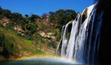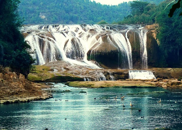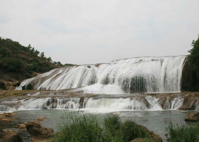 陡坡塘瀑布位于貴州省黃果樹(shù)瀑布上游1公里處,瀑頂寬105米,高21米,是黃果樹(shù)瀑布群中瀑頂最寬的瀑布。陡坡塘瀑布頂上是一個(gè)面積達(dá)1.5萬(wàn)平方的巨大溶潭,瀑布則是形成在逶迤100多米長(zhǎng)的鈣化灘壩上。陡坡塘瀑布還有一個(gè)特殊的現(xiàn)象:每當(dāng)洪水到來(lái)之前,瀑布都要發(fā)出“轟隆。轟隆”的吼聲,因此又叫“吼瀑”。