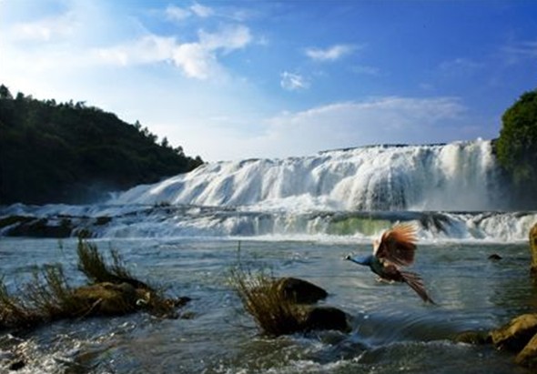 平水時(shí),白水河流量不大,水流清澈,陡坡塘瀑布顯得十分清秀嫵媚。瀑布水層沿著和緩的瀑面,均勻地撒開(kāi),在一鱗鱗的鈣華灘面上輕盈地舞著,如一層薄薄的、半透明的面紗,又如一面面張開(kāi)的素絹扇面,在陽(yáng)光下泛著銀光,故有人戲稱為“新娘面紗”。但當(dāng)洪季來(lái)臨,白水河水由于攜帶了大量由洪水沖下來(lái)的上游泥沙而呈黃色的濁流時(shí),陡坡塘瀑布便消失了往日平水時(shí)的秀色,而變得異常兇猛雄壯。黃濁的河水翻壩跌落,摧王搗冰,像一匹脫韁的野馬,且瀑布左側(cè)的鈣華堆積而成的洞穴,版權(quán)所有山東聊城聊之旅國(guó)際旅行社有限公司,轉(zhuǎn)載必究!在巨量洪水經(jīng)過(guò)時(shí)會(huì)產(chǎn)生奇特的汽笛效應(yīng),發(fā)出低沉渾厚的吼叫聲,故陡坡塘瀑布又稱為“吼瀑”。在陡坡塘瀑布的東側(cè)山崖上,有一條小瀑布從蘆葦叢中飛瀉而下,還不等水流至地面,瀑布已散成層層水霧,從小瀑旁經(jīng)過(guò),只見(jiàn)晴空綿雨,橫飄亂揚(yáng),并在陽(yáng)光下折射成美麗的彩虹。修長(zhǎng)清秀的小瀑與寬闊雄壯的陡坡塘主瀑形成一種強(qiáng)烈的對(duì)比,但似乎又和諧地組合在一起,這種瀑布組合亦是不常見(jiàn)的。陡坡塘瀑布的另一特色是在瀑下發(fā)育很寬闊平坦的灘面。灘面上遍布數(shù)十個(gè)大小不同的小碧潭,碧潭淺者只有數(shù)十厘米,深者可達(dá)數(shù)米。碧潭中還藏有魚(yú)蝦,故當(dāng)?shù)夭家雷迦顺J謭?zhí)網(wǎng)兜,去捕撈潭中的小魚(yú)蝦。在雨季時(shí),水流量奇大。陡坡塘瀑布還是拍攝西游記結(jié)尾時(shí)唐僧師徒走過(guò)的瀑布。