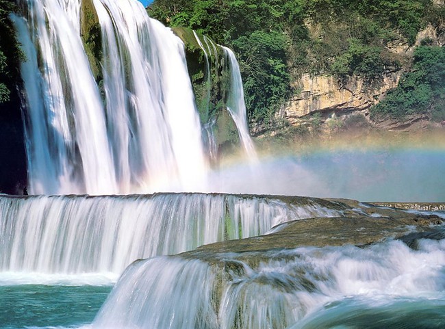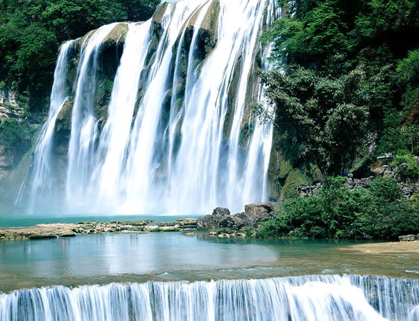 在黃果樹下游打邦河上,與黃果樹瀑布相距四十多公里。山勢(shì)在此陡然升高,峭壁對(duì)出,直插云霄,地勢(shì)強(qiáng)烈深切七百余米,河水驟然跌落,形成總落差達(dá)一百二十米的三級(jí)瀑布。打邦河將白水河、王二河、灞陵河、河斷橋等納入關(guān)腳峽瀑布,是黃果樹瀑布群中水量最大的瀑布。龍?zhí)栋岛^(qū)(安順龍宮)的龍門飛瀑,高三十四米,聲如雷鳴,氣勢(shì)磅礴,堪稱地下瀑布之冠。它和龍宮的天池、暗湖三位一體,組成龍宮的絕好景觀。