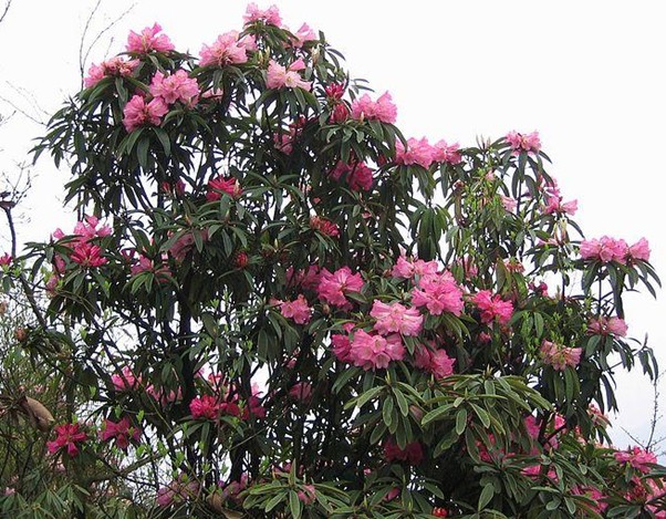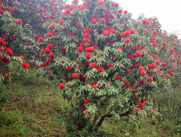 馬纓杜鵑樹(shù)身高大,花冠濃密,多的有二、三百朵?;ù厝鐖F(tuán)團(tuán)烈火在枝頭燃燒,映紅了天,映紅了地,映紅了游人的臉,映紅了四周的山。馬櫻杜鵑又叫”馬櫻花“、”索瑪花“,傳說(shuō)是索瑪姑娘的鮮血變成的圣花。