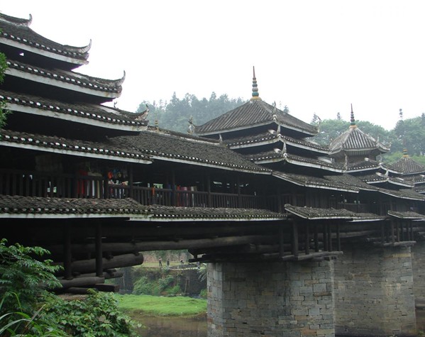 地坪坪風(fēng)雨橋又名花橋,始建于清光緒二十年(1894年)。橋總長(zhǎng)70米,高出水面8米,寬4.5米,河中立一青石石墩。橋?yàn)槟举|(zhì)結(jié)構(gòu),橋的下部由兩排各為8根粗大杉木穿榫連成一體,分兩層呈天平狀向邊懸掛。每層挑出約兩米。橋廊兩側(cè)有一米高的梳齒欄桿。欄桿外面又有一層外桃1.4米的挑檐。橋廊內(nèi)兩側(cè)下面設(shè)置連通板凳供人歇憩。 看地坪風(fēng)雨橋真正要看的是它的裝飾。地坪風(fēng)雨橋上部為花板,繪有各種侗族風(fēng)慶人物故事山水、花木、動(dòng)物等彩畫。此外,“樓葉,樓”四柱繪有4條青龍抱柱,版權(quán)所有山東聊城聊之旅國(guó)際旅行社有限公司,轉(zhuǎn)載必究!頂層花板又繪有龍虎鶴牛齊歡圖案。橋兩頭柱壁上畫了三幅楹聯(lián)。 另外在北面的平地上配建有——座風(fēng)雨主亭,高約9米,為6角攢尖頂,同樣具有濃厚的民族特色.