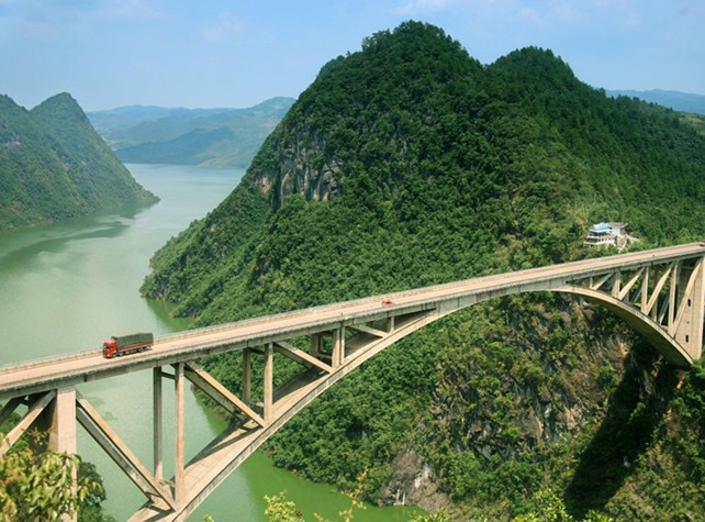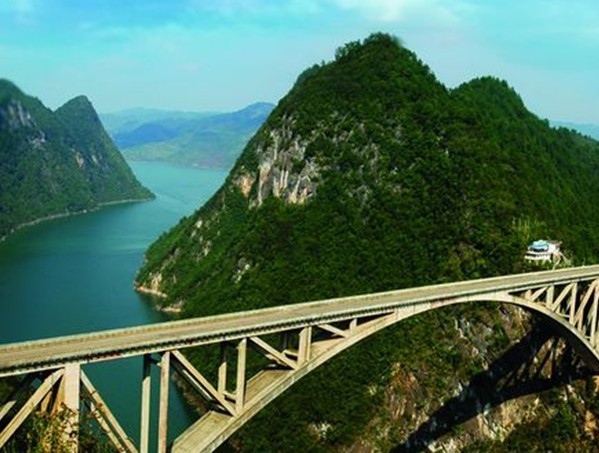 江界河大橋是交通部和貴州省重點科研項目“大跨度桁式組合拱橋研究”課題的依托工程,1995年12月竣工通車。該橋位于甕安縣境內(nèi)的烏江中游峽谷上,全長461米,主孔跨經(jīng)330米、寬13.4米,橋面距水面高263米。大橋采用人字桅桿吊機懸拼吊裝架設,其跨度居目前世界同類橋型之首,為世界第一座大跨度桁式組合拱橋,此項技術(shù)的研究和應用1996年獲貴州省科技進步一等獎,貴州省第9次優(yōu)秀工程設計一等獎,1997年度國家科技進步二等獎,1996年和1997年度獲交通部公路工程優(yōu)質(zhì)工程一等獎。江界河大橋的建成,不僅溝通了甕安與遵義的公路交通,方便了兩地人民的經(jīng)濟交往,而且為四川、重慶車輛經(jīng)貴州入廣西、湖南提供了一條新的捷徑。