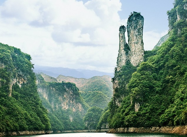 景區(qū)以高峽平湖、瀑泉飛流、喀斯特為主體;山色水韻風(fēng)光迷人。“破鏡重圓”半含水中半露崢嶸;鴛鴦夫妻結(jié)隊(duì)?wèi)蛩?,情深意濃;奇妙的三疊水、珠落玉盤直瀉深潭;喊泉神靈有喊必應(yīng),呼之水出、止呼水隱;石峰神形如“孔雀開屏 ”、形態(tài)逼真;“大圣師徒”前往探幽,忙里偷閑,整個景區(qū)一灣一畫,一步一景,令游人忘返流連......。神秘的下舞陽,不是天堂勝似天堂。鮮明的個性特征之所撼動人心,主要在于下舞陽具有長江三峽之雄;蜀地蛾眉之秀;桂林漓江之美;陽朔勝景之幽而名冠天下。凡游覽過下舞陽的客人,無不恭維贊譽(yù)其幽谷、山色、水景為天下絕色、嘆為觀止。清代愛國將領(lǐng)林則徐曾在此留下著名詩章: