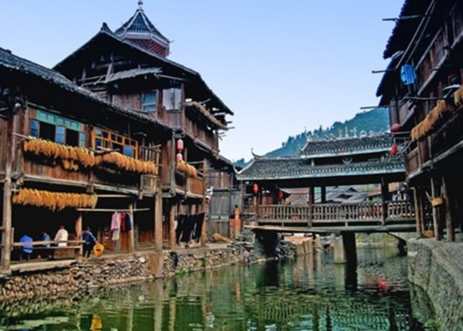 肇興,舊稱[肇洞],位于黎平縣城南70公里,是全國最大的侗寨,有世界最大的侗寨鼓樓群。全寨居住3415人,聚居侗族3125人,全為陸性侗族,分為仁、義、禮、智、信五大房族,各自建有鼓樓、花橋,大小不一,高低不等,風(fēng)格各異,別具匠心。寨子里桿欄式吊腳樓房,鱗次櫛比,疏密有致,全用杉木建造。有眾多的花橋、戲樓、歌坪、禾晾、谷倉、瓢井、侗民居中等建筑,布局緊湊,結(jié)構(gòu)合理。