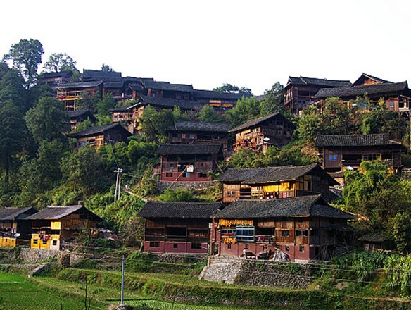 郎德苗寨位于凱里市東南27公里的苗嶺腹地,分上下兩自然寨。對(duì)外開(kāi)放的是上郎德,因此正規(guī)一點(diǎn)的叫法應(yīng)該是“朗德上寨”。作為全國(guó)第一個(gè)民俗風(fēng)情村寨游覽地這里是有名有實(shí):吊腳樓、蘆笙堂、風(fēng)雨橋一個(gè)都不少。節(jié)日期間或旅行團(tuán)來(lái)到時(shí)會(huì)有熱情的迎客儀式和盛大的蘆笙舞、銅鼓舞、板凳舞等苗族歌舞表演。后來(lái)在各地興起的“民族村”都是在它的啟發(fā)下建立的。