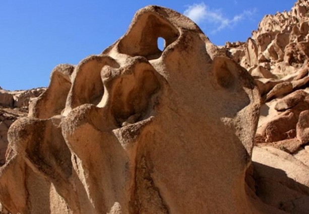 怪石山距巴里坤縣城60公里,有10多公里的便道與縣城至煤礦的柏油公路相接,位于巴里坤湖西北7公里外小夾山的最東端。怪石山最怪的就是滿山的形狀各異的小石窟,幾座山從山頂?shù)缴侥_都是“千瘡百孔”,有的稱“蜂窩崖”,有的稱“千佛洞”或“萬佛龕”、“千窟崖”等。每當(dāng)下暴雨時水從山頂流下,那山便成了無數(shù)個小水簾洞,景致令人叫絕!怪石山下就有一眼泉水,是著名的巴里坤八景之一——“鏡泉宿月”的上鏡兒泉所在。