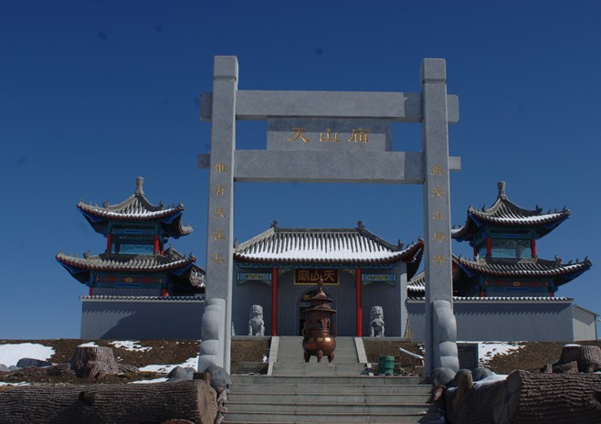 最為貼切地道出了此廟的歷史地位和特點(diǎn)。這一帶為高山草甸夏牧場(chǎng),站在山頂遠(yuǎn)眺,盤(pán)山公路、鳴沙山、巴里坤草原盡收眼底,美不勝收。天山廟是位于海拔近3000米的天山之巔唯一的一座廟宇,地勢(shì)孤高,氣候瞬息萬(wàn)變,六月下雪是平常事。在天山廟俯瞰天山九曲十八彎的盤(pán)山道,郁郁蔥蔥的松林、潔白的雪山、碧綠的草原、裊裊的炊煙,盡收眼底,心曠神怡。