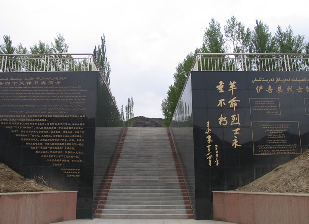 烈士陵園是伊吾人民為了緬懷在伊吾四十天保衛(wèi)戰(zhàn)中壯烈犧牲的革命烈士而建的。1950年春,在伊吾曾經(jīng)發(fā)生了震驚全國、震破敵膽的伊吾四十天保衛(wèi)戰(zhàn)。奉毛主席向新疆進軍、屯墾戍邊的命令,我解放軍一營二連全體官兵在全國戰(zhàn)斗英雄胡青山副營長的率領(lǐng)下先后進駐伊吾。1950年的伊吾偽縣長艾拜都拉與匪首烏斯曼、堯樂搏斯相勾結(jié),企圖以伊吾為據(jù)點發(fā)起大規(guī)模的武裝叛亂。解放軍進駐伊吾后,兵分三路,一路由全國勞動模范趙富貴連長帶領(lǐng)進駐淖毛湖,一路進駐下馬崖,還有一路由胡青山副營長駐扎在縣城。解放軍進駐伊吾后叛匪加快了叛亂活動,他們秘密切斷了電話線、破壞了交通、裹脅走了縣城的所有居民,我解放軍一營二連就是在這種內(nèi)無群眾支持、外無援軍的情況下,監(jiān)守山城四十個日日夜夜,終于堅持到大部隊援軍的到來,取得了伊吾四十天保衛(wèi)戰(zhàn)的全面勝利。彭德懷總司令發(fā)來慰問電嘉獎二連,并且被解放軍西北軍區(qū)第一野戰(zhàn)軍授予“鋼鐵英雄連”的光榮稱號。