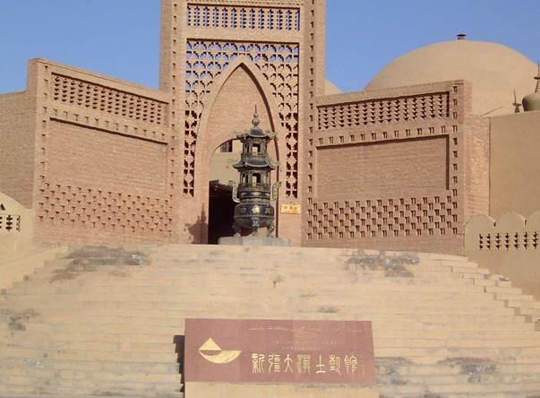 從312國道的勝金口往北拐上前往柏孜克里克千佛洞的旅游專線公路四公里處,便可看到千平方米的大型停車場后的高坡上矗立著一座高大的民族風(fēng)格建筑群,正中是十四米高的磚砌圖案大門,這就是大漠土藝館的正門。走進(jìn)大門,迎面可見三座互相連通的穹頂,穹頂頂端和四周布滿了小塔,好似金鋼寶座塔廟,這就是恢宏巨制的古代佛教藝術(shù)館---萬佛宮,是大漠土藝館的主體工程。這個大型宮堡由三個直徑十米、高十二米的窟窿頂建筑組成,是迄今新疆境內(nèi)最大的佛教藝術(shù)殿堂。據(jù)考古學(xué)家發(fā)現(xiàn),新疆古代的佛寺不少就是采用了這種式樣的建筑。有趣的是,世界三大宗教:基督教、佛教、伊斯蘭教都對窟窿頂建筑情有獨(dú)鐘。進(jìn)入宮內(nèi)迎面一尊十米高的彩繪大佛雄偉壯觀、氣派不凡,是依據(jù)焉耆出土的雕塑精品紅衣佛放大塑造的。東西二廳的壁畫以拜城克孜爾千佛洞、吐魯番柏孜克里克千佛洞珍寶穹被盜走和損毀嚴(yán)重的壁畫為藍(lán)本,由專家研究考證、復(fù)原繪制出的,新疆境內(nèi)有代表性的古代佛教壁畫一千二百余平方米,都覆蓋在宮內(nèi)自地面到頂端的墻壁上,工程巨大,耗時四載。來此參觀的游客足不出宮便可盡覽新疆古代佛教藝術(shù)的大略。
