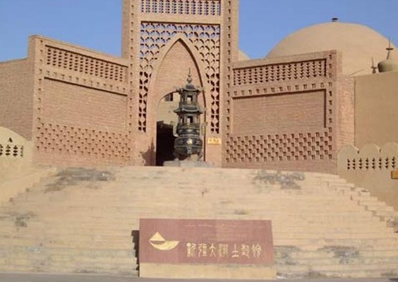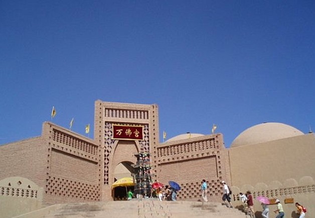 煙云燎繞的火焰山下,郁郁蔥蔥的木頭溝畔,一座規(guī)模宏大的人文 景觀,以其獨(dú)特的藝術(shù)風(fēng)格,屹立在312國(guó)道西側(cè),它就是1991年5月對(duì) 外開放接待游人的新疆大漠土藝館, 地理坐標(biāo)89°32′7″E,42°56′ 8″N,海拔140米,由312國(guó)道的勝金口往北拐上前往柏孜克里克干佛洞的旅游專線公 路四公里處,便可看到大型停車場(chǎng)后的高坡上矗立著一座高大的民族風(fēng)格建筑群,正中是十四米高的磚砌圖案大門,一看便知是吸收維吾爾建 筑風(fēng)格和吐魯番葡萄晾房而設(shè)計(jì)的,這就是新疆大漠土藝館。進(jìn)得大門便是幾座大小不一、錯(cuò)落有致、下方上圓的穹窿頂建筑,一股西域所特有的神秘氣息撲面而來(lái),誘人遐想。穿過前院,迎面是三座互相連通的穹頂,穹頂四周布滿小塔,酷似金剛寶座塔廟,這就是恢宏巨制萬(wàn)佛宮,是大漠土藝館的主體工程。這個(gè)大型宮堡由三個(gè)直徑十米、高十二米的穹窿頂建筑組成,是迄今新疆境內(nèi)最大的古代佛教藝術(shù)殿堂。