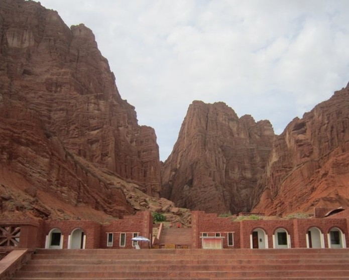 大峽谷近似呈南北弧形走向,開(kāi)口處稍彎向東南,末端微向東北彎曲,由主谷和七條支谷組成,全長(zhǎng)5000多米,谷端至谷口處自然落差200米以上,谷底最寬53米,最窄處0.4米,僅容一人低頭彎軀側(cè)身通過(guò)。谷側(cè)奇峰嶙峋,爭(zhēng)相崛起;峰巒疊嶂,劈地摩天,崖奇石峭,磅礴神奇;神洞秘窟,各蘊(yùn)其意。谷內(nèi)蜿蜒曲折,峰回路轉(zhuǎn);步步有景,舉目成趣;泉水叮咚,鳥(niǎo)叫蟬鳴,寒暑不浸,游人稱絕。整個(gè)峽谷猶如一條尾震天山頭,口飲庫(kù)河流(開(kāi)口于庫(kù)車河),曲身九十九的巨龍劈山而臥,呼風(fēng)喚雨,神秘莫測(cè)。更令人稱奇的是,距谷口1400米深處,高約35米的崖壁上,有一始建于盛唐時(shí)期,壁畫(huà)丹青的千佛洞遺址,就文字記載和繪畫(huà)藝術(shù)而言,在古西域地區(qū)至今已發(fā)現(xiàn)的300多座佛教石窟中絕無(wú)僅有,實(shí)屬罕見(jiàn)。無(wú)山不成谷,峰奇谷更幽。峽谷區(qū)域平均海拔1600米,最高山峰2048米。組成峽谷的奇峰群山由赭色的泥質(zhì)沙巖構(gòu)成,當(dāng)?shù)鼐S吾爾語(yǔ)叫做“克孜利亞”,即紅色的山崖。神秘大峽谷正處在當(dāng)今中國(guó)九大影視基地之一的克孜利亞勝景中。龐大的紅色山體群形成于距今1.4億年前的中生代的白堊紀(jì),經(jīng)億萬(wàn)年的風(fēng)剝雨蝕,洪流沖刷,形成縱橫交錯(cuò),層疊有序的垅脊與溝槽,遠(yuǎn)看如詩(shī)如畫(huà),狀若“布達(dá)拉宮”,仙天瓊閣;近瞧若人似物,如夢(mèng)似幻,惟妙惟肖,神韻萬(wàn)端。令人有鬼斧神工,奇景天成之慨嘆。尤以谷口處的三座山體(乃頭山、麗人山、佛面山)最為壯觀。特別在夕陽(yáng)斜射,朝霞映山,極目遠(yuǎn)眺,色艷紅天。大有不是火焰山,勝似火焰山之奇感。