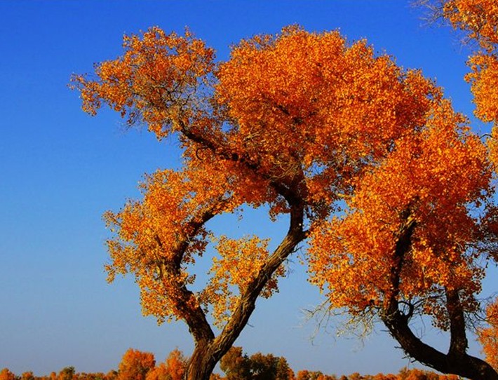 在我國巴音郭楞自治州最長的內(nèi)陸河塔里木河,分布著世界唯一的最大原始胡楊森林公園保護區(qū),全世界胡楊林有百分之十在中國,而中國的胡楊林有百分之九十在新疆塔里木河畔。它的祖先遠在一億三千五百萬年前早就出現(xiàn)了,被地質(zhì)學家稱為“第三世紀活化石”是世界上最古老的一種楊樹。