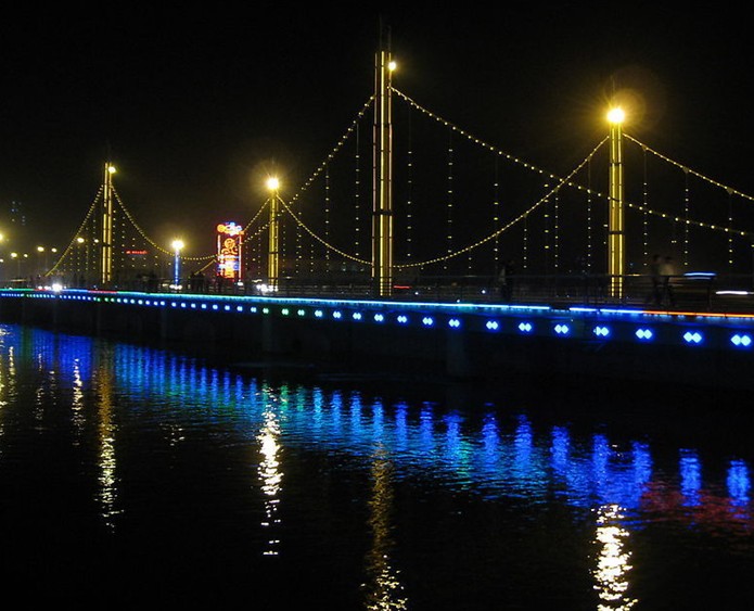 孔雀河橫穿庫(kù)爾勒市區(qū),把庫(kù)爾勒市分為南北兩半,北面以州市地方單位為主,南面以塔里木勘探開發(fā)指揮部及石油單位為主。在市區(qū)長(zhǎng)達(dá)七公里的孔雀河上共有五座橋,有孔雀河大橋、獅子橋、建設(shè)橋、團(tuán)結(jié)橋等。上游的孔雀河大橋是314國(guó)道跨越孔雀河上目前最大的橋梁,橋跨150米,寬24。5米,是我國(guó)西北地區(qū)最大的一處拱形鋼橋,河面無(wú)橋墩,它是孔雀河在庫(kù)爾勒市區(qū)的一處重要景觀,是孔雀河濱風(fēng)景旅游帶上一道獨(dú)特風(fēng)景線。近些年庫(kù)爾勒市從實(shí)際出發(fā),利用孔雀河穿城而過(guò)的優(yōu)勢(shì)建設(shè)了孔雀河風(fēng)景旅游帶工程。風(fēng)景帶基礎(chǔ)設(shè)施完善,綠草如茵、鮮花怒放、景色宜人,成為市區(qū)一道亮麗的綠化美化線和旅游風(fēng)景線。一方水土,因風(fēng)雅而美麗;一座城市,因歷史的積淀和教養(yǎng)而文明。版權(quán)所有山東聊城聊之旅國(guó)際旅行社有限公司,轉(zhuǎn)載必究!現(xiàn)在的孔雀河市區(qū)段玉水如帶,百步一景。清晨,薄霧輕紗,爽氣怡人;晚間,夕陽(yáng)鋪水,依稀將人帶入夢(mèng)中仙境。早晨鍛煉身體的人在這里吐故納新,采天地之精華;傍晚,休閑的人們?cè)谶@里納涼散步,觀夜景之妙。如潮的人流摩肩接踵,使孔雀河畔洋溢出一種節(jié)日的氣氛。