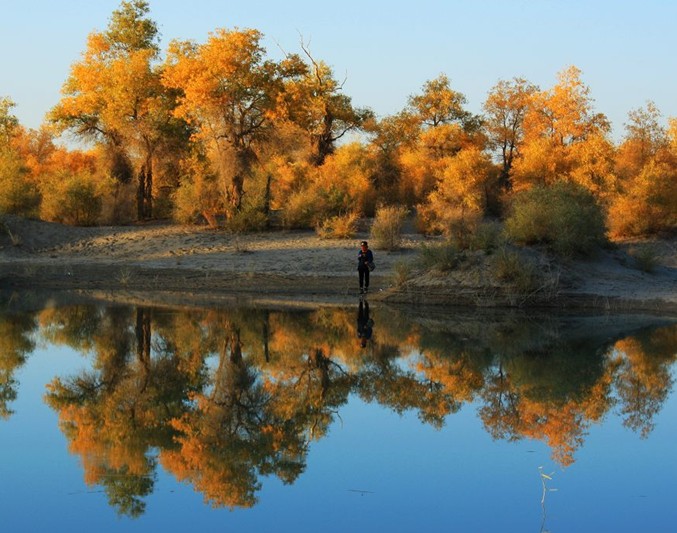 曠野上隨處可見(jiàn)輪臺(tái)油田高聳藍(lán)天的井架、排列齊整的鉆機(jī)和車(chē)隊(duì)以及井口噴射的朵朵烈焰,使昔日覺(jué)寂的荒原,充滿活力和生機(jī)。該公園現(xiàn)建有木頭賓館、磚砌的四合院接待站和食堂,可解決旅客的食宿。公園接待站后院高聳著一座二三十米高的了望鐵塔,登上塔頂,但見(jiàn)蔚藍(lán)的塔里木河蜿蜒曲折,散成眾多的汊流,汊流間布滿胡楊林。胡楊林海,順著塔里木河一直伸向茫茫天際,好不壯觀!森林公園色彩絢麗多變,綠樹(shù)、碧水、藍(lán)天,猶如一幅濃重的水墨畫(huà)。秋初黃綠相間,深秋一片金黃。公園中建有水榭、湖心亭,備有游船、汽艇可供開(kāi)展巡河觀光。這里的河汊全長(zhǎng)7千米,開(kāi)始段呈長(zhǎng)圓開(kāi)如湖蕩,水中建有湖心亭,各種水鳥(niǎo)珍禽集隊(duì)飛翔鳴啼在湖面和森林中,湖中樹(shù)木倒影清晰,環(huán)境靜謐,空氣清新,漫步湖濱,令人心曠神怡;河汊中間段水面寬闊,汪洋一片,水波蕩漾,水中到處布滿奇開(kāi)怪狀的枯樹(shù)與樹(shù)樁,船行其間猶如穿梭在梁山泊的水寨間,別有情趣,河汊末端水道收縮變窄,形成條條港汊,水流紋絲不動(dòng),水平如鏡,河汊兩邊的胡楊林連同藍(lán)天白云倒映水中,其影像比明鏡中的影子還要清晰逼真,令游人叫絕;河汊末端是蘆葦蕩和胡楊紅柳沙丘群,潔白的葦花蕩和胡楊紅柳沙丘群,潔白的葦花在逆光透射下發(fā)出誘人的銀白色光芒;牛、羊群悠閑地覓食在紅柳沙包中。登上沙丘頂,向南望,胡楊林一眼望不到邊;向北遠(yuǎn)眺,沙漠油井噴射的火焰映紅了藍(lán)天。這如詩(shī)如畫(huà)的美景迷倒了無(wú)數(shù)的游人,令人流連忘返,特別是那些攝影愛(ài)好者和畫(huà)家,在這里一住就是一周甚至半月。