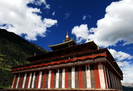 查杰瑪大殿的紅殿和白殿逐漸向里收分,又飾以飛檐金頂、呈飄逸升騰之勢。加之整座大殿在顏色運(yùn)用上十分豐富版權(quán)所有聊城聊之旅國際旅行社有限公司,轉(zhuǎn)載必究!,對比強(qiáng)烈,上白中紅下花,極富層次和立體感。經(jīng)過巨大的寺門進(jìn)入殿中,抬首隨處可見雕塑精美的菩薩神佛塑像和不計(jì)其數(shù)的唐卡。查杰瑪大殿是類烏齊寺的主殿。大殿為三層,分別由三種顏色繪飾。第一層為“條花殿”,墻高13.5米,外墻用紅、白、黑三種顏料涂添豎形紋飾,每道豎條有1米多寬。殿內(nèi)有巨型大柱64根,每根筆直粗大的木柱高達(dá)15米。第二層為 “紅殿”,外墻涂抹紅色,樓高9米。第三層稱之為“白殿”,墻體涂白色,樓高5米。殿頂有金頂直指蒼穹。