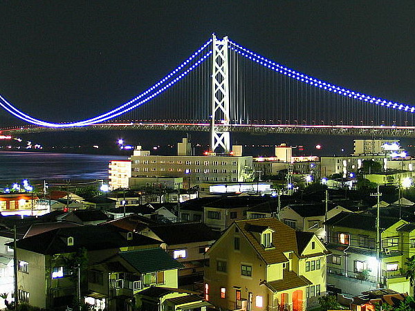 明石海峽大橋:連接本州島和淡路島的明石大橋,于1998年4月開通,全長3,911米,是世界上最長的吊橋。夜晚時候開起燈火,整座大橋猶如珍珠裝飾,故有“珍珠大橋”的美稱。燈光的開放十分講究,平日開四季之顏色的燈,周末與節(jié)日開藍綠色的燈。舉辦活動時,燈光顏色會不斷變化。報時的時候,整點是彩虹色、半點是寶石色。