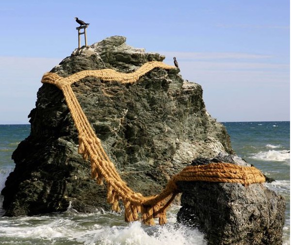 日本各地,有幾十個(gè)“夫婦巖”,以三重縣夫婦巖最為有名。由一根粗大的草繩海上一大一小兩塊礁石連結(jié)在一起,是喜結(jié)良緣、家內(nèi)安全的象征。兩塊礁石離岸邊660米,男巖高9米,女巖高4米。連結(jié)它們的稻草繩叫做“注連繩”,每年要更換三次。