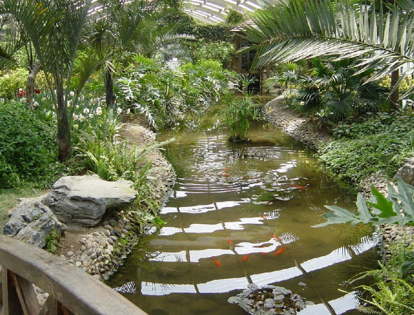 位于公園中部,溪流到此處寬狹不等,曲折多變。河兩岸群植竹、杉及灌木,河邊楊柳飄絲,南岸樹叢中隱現(xiàn)一只面積18.5平方米的竹亭。北岸有座呈直角形的綠蔭茶室,墻體為毛石砌就,外形樸素、粗獷,部分建筑伸出水面,有竹甬道與岸相聯(lián),建筑面積350.25平方米。室內(nèi)設(shè)裝飾壁爐,墻上懸掛獸頭鹿角,野趣盎然。景區(qū)南有座三孔石拱橋,長13米,寬3.1米;橋上的花崗石亭面積10平方米。過橋向西有組蘑菇亭,混合結(jié)構(gòu),面積共30.6平方米,亭下配有石桌石凳。
