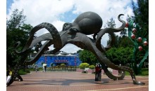 廈門(mén)海底世界占地17.5公頃,總建筑面積7500平方米。它是由新加坡華僑與鼓浪嶼風(fēng)景區(qū)建設(shè)開(kāi)發(fā)公司合作興建的,總投資1000萬(wàn)美元。這座花壇簇?fù)淼暮K{(lán)色水晶宮建筑,第一期工程先后建成了海洋館、企鵝和淡水魚(yú)館。其入口處在主體建筑外60米地方有一個(gè)設(shè)計(jì)獨(dú)特、別具一格、張牙舞爪的章魚(yú)雕,高6米、跨徑11.2米。它是廈門(mén)海底世界的標(biāo)志性建筑,也是游客們首先拍照留念的景觀。