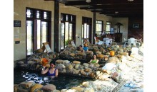 投資2.3億元依山而建的古兜溫泉,集山、泉、湖、海為一體,風景優(yōu)美,有著豐富的溫泉資源,在古兜山下新近落成的溫泉谷,格調(diào)高雅,打造出一個不同凡響的溫泉王國。溫泉谷中間有一條約150米長的人工鵝卵石河道,它不僅為景區(qū)增添了春山幽谷的野趣,更和中央水區(qū)的大舞臺及各大小泡池相連,將谷內(nèi)建筑群落自然分成了三大區(qū)域:北邊是歐式風格的“羅馬殿”,東邊則是日本和式風格的“東瀛閣”,南邊是“唐宮”。