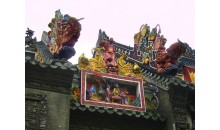 陳家祠為三進院落四合院式布局,占地面積4000多平方米,主體建筑均為硬山頂,面寬進深各三間,抬梁與穿斗混合式梁架結構。中座前為一大石階平臺,旁圍石柱欄桿華板,工藝精細。兩側廡廊,以木雕飛罩間隔,各分三間,花鳥蟲魚,鏤空雕刻,長廊屏門,上則格心通花彩色玻璃,下則刻花裙板,朱欄畫棟,富麗堂皇。中座后壁,全為五米多高的坤甸木雕花大屏風,雕工精美古樸壯觀,現存的巨型木雕祭桌,獸首柱腳,古拙凝重。