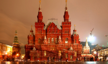 俄羅斯國家歷史博物館(The State Historical Museum)位于俄羅斯莫斯科紅場(chǎng)北側(cè)的馬涅什廣場(chǎng)上,是一座建筑造型非常美麗且極具新俄羅斯風(fēng)格的朱紅色建筑物;在主體建筑物的兩側(cè)各有一座高聳對(duì)稱的塔樓,還有裝飾性的尖塔、三角檐與圓拱型窗戶。