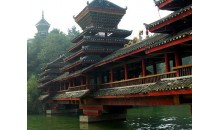 地坪坪風(fēng)雨橋又名花橋,始建于清光緒二十年(1894年)。橋總長70米,高出水面8米,寬4.5米,河中立一青石石墩。橋?yàn)槟举|(zhì)結(jié)構(gòu),橋的下部由兩排各為8根粗大杉木穿榫連成一體,分兩層呈天平狀向邊懸掛。每層挑出約兩米。橋廊兩側(cè)有一米高的梳齒欄桿。欄桿外面又有一層外桃1.4米的挑檐。橋廊內(nèi)兩側(cè)下面設(shè)置連通板凳供人歇憩。 看地坪風(fēng)雨橋真正要看的是它的裝飾。