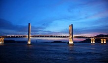 澳門(mén)“友誼大橋”,工程原稱新澳氹大橋,1994年初建成通車(chē)。位于舊大橋(嘉樂(lè)庇總督大橋)以東,連接澳門(mén)半島新口岸水塘北角(外港碼頭處)與氹仔北安碼頭。橋?qū)?5米,設(shè)兩條雙線車(chē)道,中設(shè)分隔線,車(chē)道兩旁設(shè)1.5米寬的行人道。